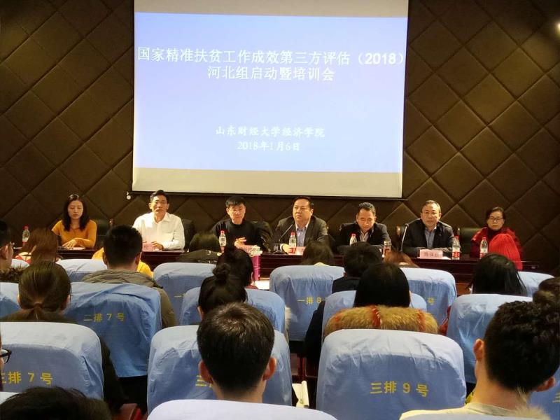 2018�1�6日,我校召开国家精准扶贫工作成效第三方评估重大任务(2018)河北组动员暨培训会,动员部署评估工作。山东财经大学校党委副书记车滨出席会议并讲话�山东省政府研究室宏观处调研员候西栋、经济学院副院长陈保启、经济学院党委副书记任海伦、仵颖涛出席会议�国家精准扶贫工作成效第三方评估重大任务(2018)河�评估�70名师生参加了会议;会议由经济学院院长、评估组组长董长瑞教授主持�