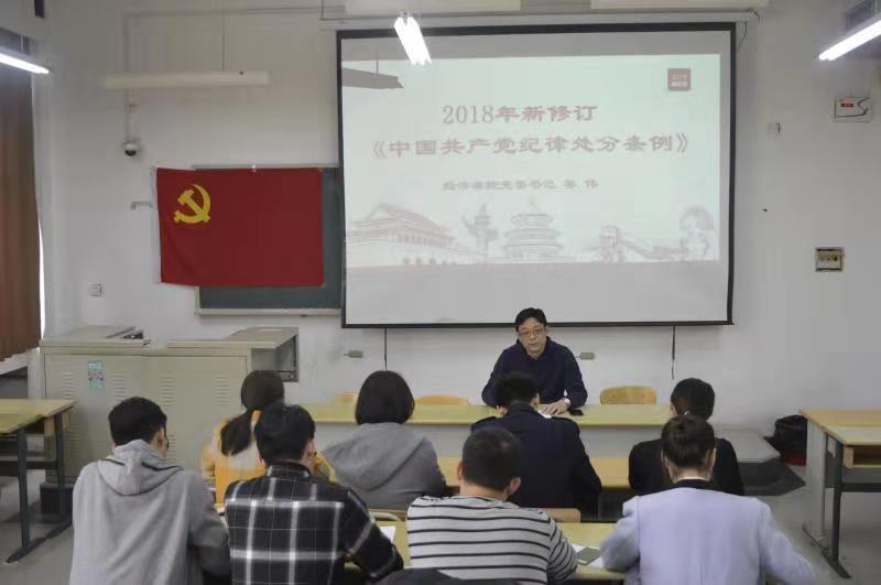 姜伟�2018年新修订《中国共产党纪律处分条例》为主讲内容�希望与会人员增强“四个意识”,提高政治站位,深刻领会《条�》修订的重大的意义�同时他还对支部党员提出以下要求:坚定政治方向不动摇;维护党内团结、民族团结;维护公平正义;恪尽职守,增强自律意识。希望大�深入学习,坚定理想,投身建设,早日报效国家�