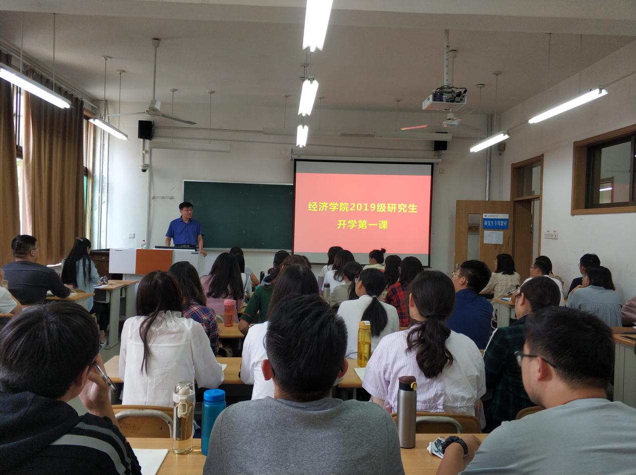2019�9�16日下午,山东财经大学经济学院院长董长瑞于舜耕校区教学楼3303�2019级研究生新生讲授“开学第一课”,鼓励学生“立信仰有所信、学有成有所为、炼心志有所守”,经济学院全体研究生新生认真聆听研究生第一课�