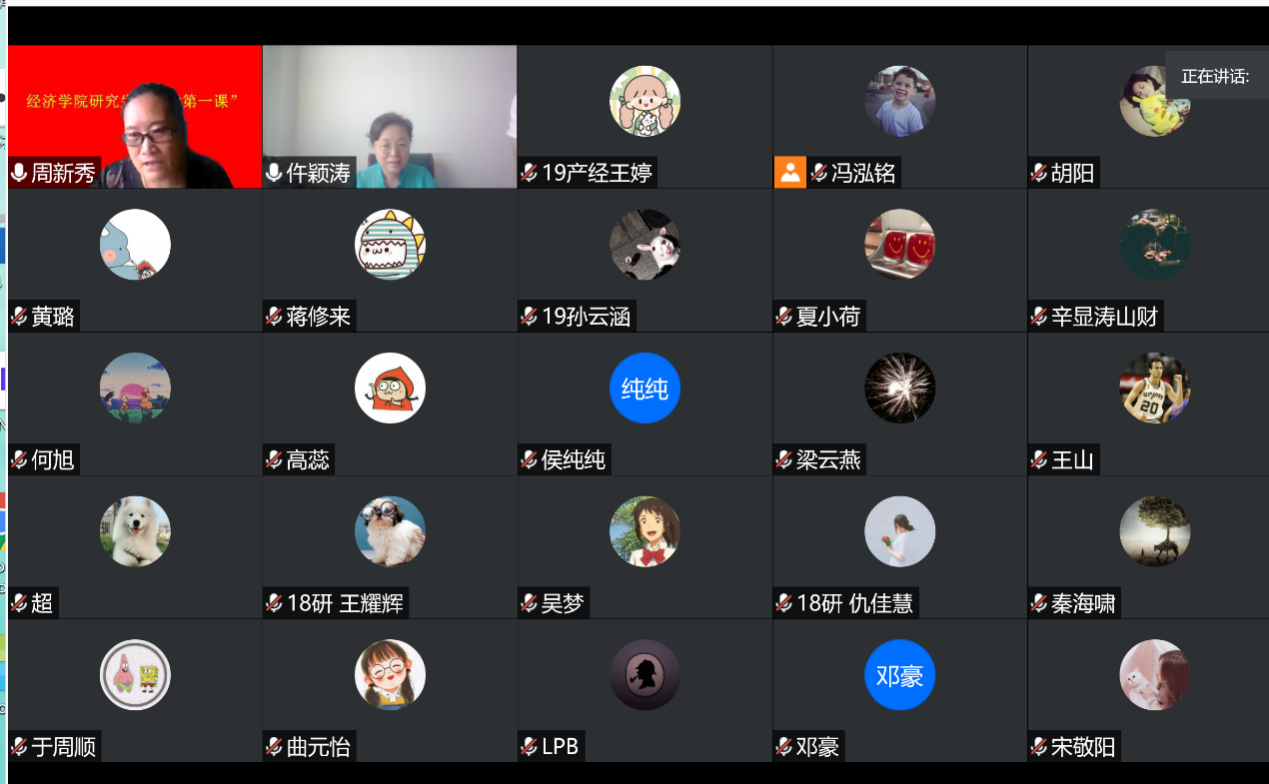 2020�8�31日上�10点,以“加强疫情防控,强化制度认同”为主题的经济学院研究生“开学第一课”在线上顺利举行。经济学院党委副书记仵颖涛和学工办主任周新秀分别作了题为“深刻认识疫情防控形势的复杂性与长期性,慎终如始毫不放松抓好常态化疫情防控”和“遵守校规校纪,做好疫情防控工作”的讲话�2018级和2019级全体研究生参与会议,会议由周新秀老师主持�