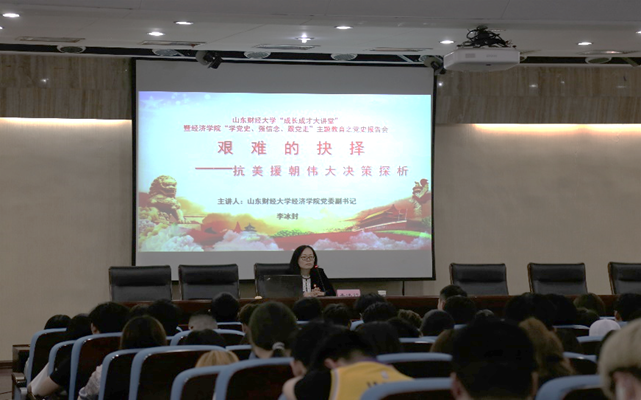 (通讯员:付雯 韩云昕)为深化学院党史学习教育,弘扬伟大的抗美援朝精神,5�14日下午,经济学院于圣井校区敏行楼举办学校成长成才大讲堂暨“学党史、强信念、跟党走”主题教育党史报告会。报告会由经济学院党委副书记李冰封主讲,院学工办主任裴斐、团委书记付雯、党委专职组织员王琦出席报告,经济学�2018级�2019级�2020级部分党员、入党积极分子和团员青年参加,报告会由裴斐主持�