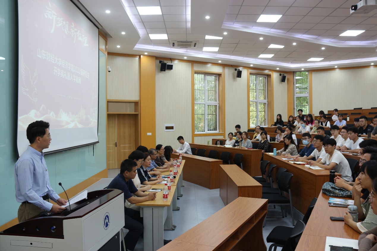 9�13日下�16:00,经济学�2021级研究生新生开学典礼暨入学教育大会于舜耕校区第三阶梯教室举行。学院党委书记姜伟,党委副书记高峰、李冰封,副院长彭留英、齐杨,团委书记付雯,党委专职组织员王琦,研究生秘书刘应涛出席会议,2021级全体研究生新生到场参加。会议由付雯主持�