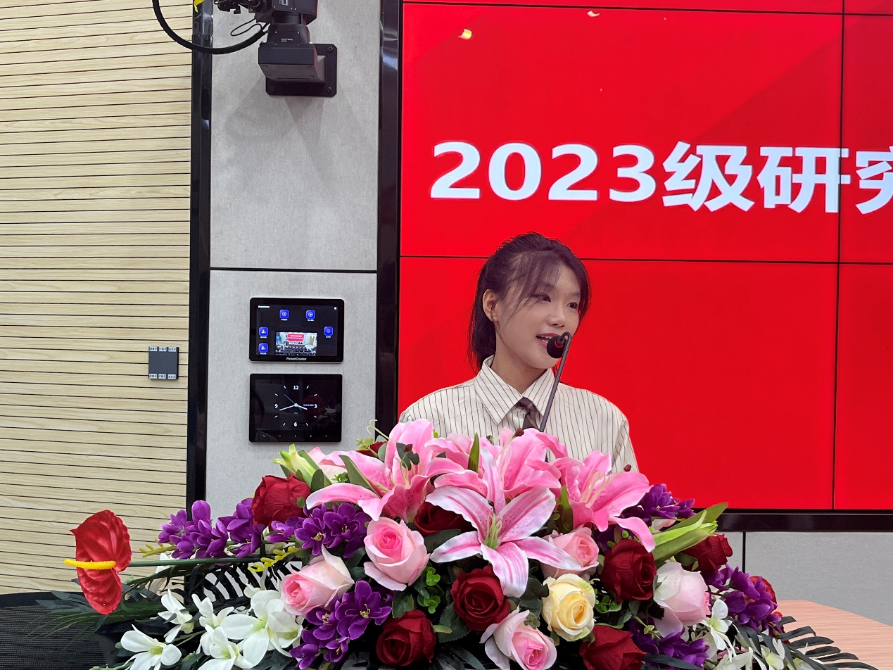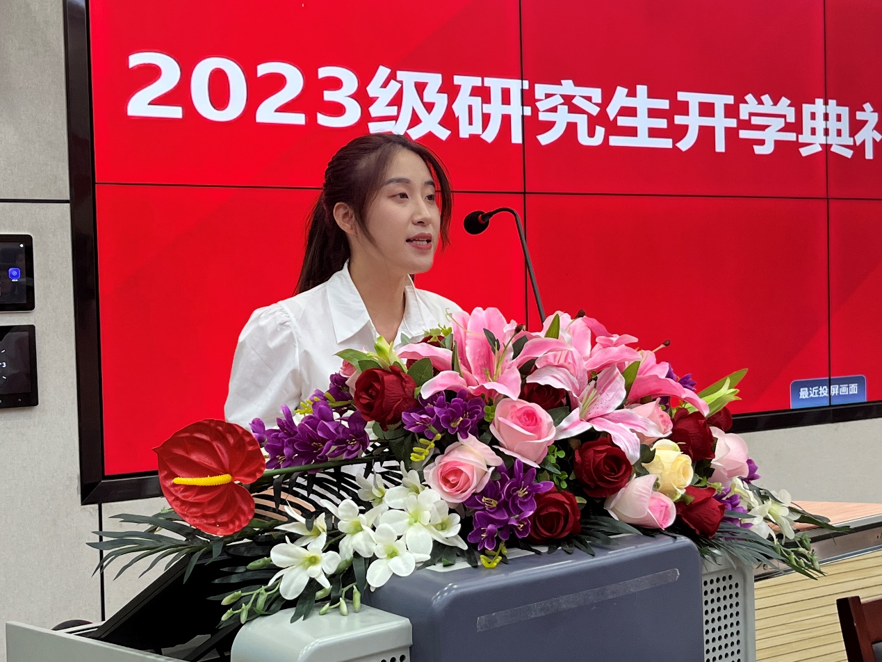 老生代表白梦蝶、新生代表董亚萍先后发言,号召全体研究生新生转变观念和心态,脚踏实地、善于创造,甘于奉献、力求上进。