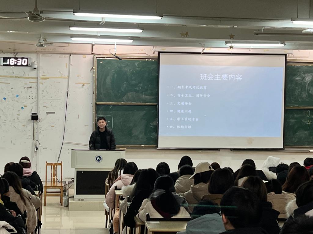各班辅导员分别从宿舍卫生消防安全、交通安全、学生个人健康监测、心理健康、学工系统平台使用、期末考风考纪和毕业生就业等方面对全体同学提出要求:一要严格请销假做好晚签到,因事因病及时履行请销假手续,每晚按时在学工系统宿舍晚点名签到,杜绝未经请假擅自旷课、夜不归宿等情况的发生;二督促学生做好个人健康监测,要树立“个人健康第一责任人”理念,做好个人防护,养成良好的个人卫生习惯,合理饮食和锻炼,做好自我健康监测;三要认真做好公寓安全管理,引导学生注意用电安全,不使用违规电器,注意电线插排使用,不在宿舍抽烟,明确做到“八个禁止”;四要重视交通安全,受雨雪影响校园内道路结冰湿滑,引导教育学生减少外出,防止摔伤,确需外出时留意道路安全。骑电动车务必严格落实佩戴头盔,不要带人,遵守交通规则,放假回家一定乘坐有安全资质的车辆;五要注重心理健康教育,学会调节自己的心理和情绪,用积极乐观的态度去面对生活,努力消除心理不适对学业、生活带来的不良影响;六要严肃考风考纪,引导学生科学合理规划期末复习并告诫同学们严格遵守各项考试纪律,不做违纪之事,不抱侥幸心理,不踩考试违纪“高压线”,并从生活中的日常小事做起,培养诚信做人、诚实做事的品质;七鼓励毕业生积极就业,给毕业生科学分析了当今社会的就业形势和政策,激励毕业生认清就业形势坚定就业信心,在思想上、行动上早做准备,树立正确的成才观、职业观和就业观。