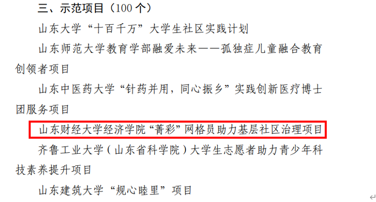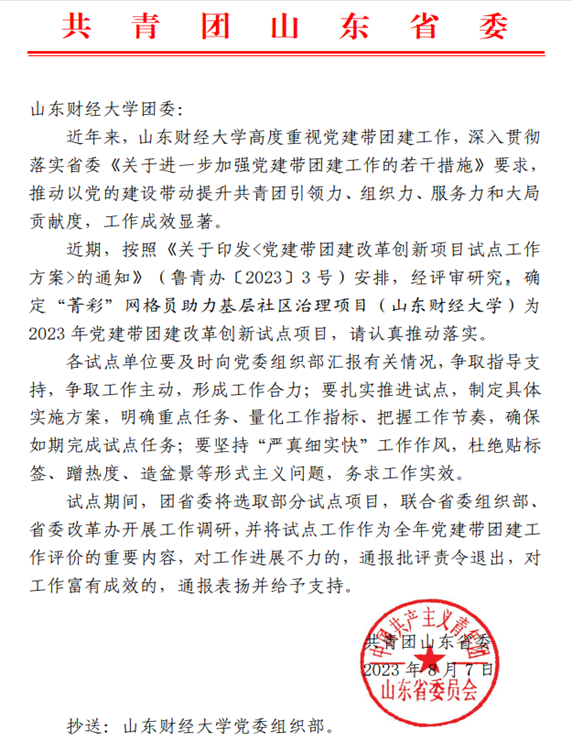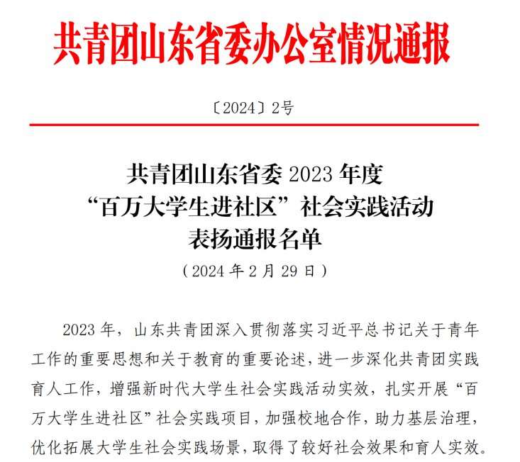 “菁彩”网格员助力基层社区治理项目获批共青团山东省委2023年党建带团建改革创新试点项目,共青团山东省委2023年度“百万大学生进社区”社会实践活动示范项目,姜琛同学获共青团山东省委2023年度“百万大学生进社区”社会实践活动先进个人。
