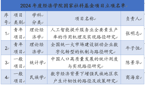 获立4项。其中,一般项目2项,青年项目2项,立项总数占全校18%,立项数位居全校教学科研单位第1。从立项学科来看,理论经济学2项,统计学1项,民族学1项,其中民族学项目是一帆视频