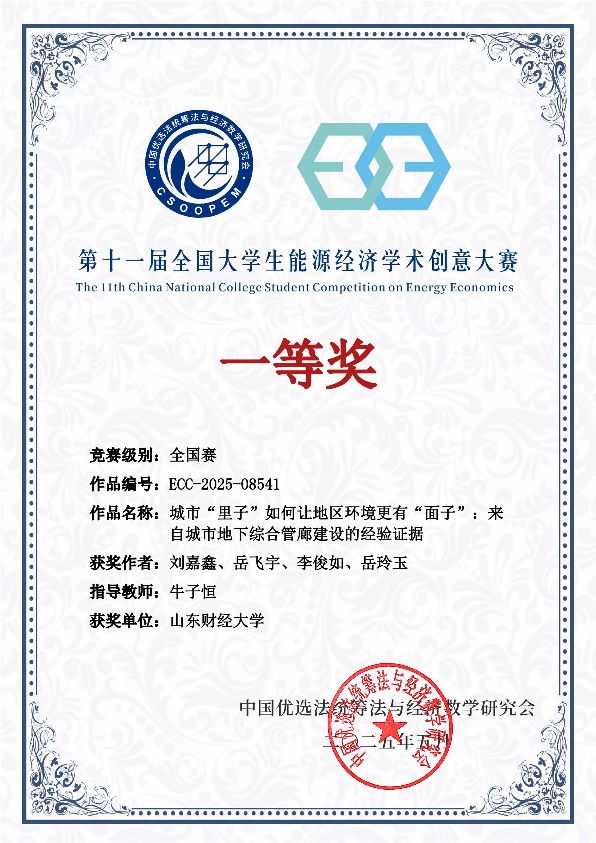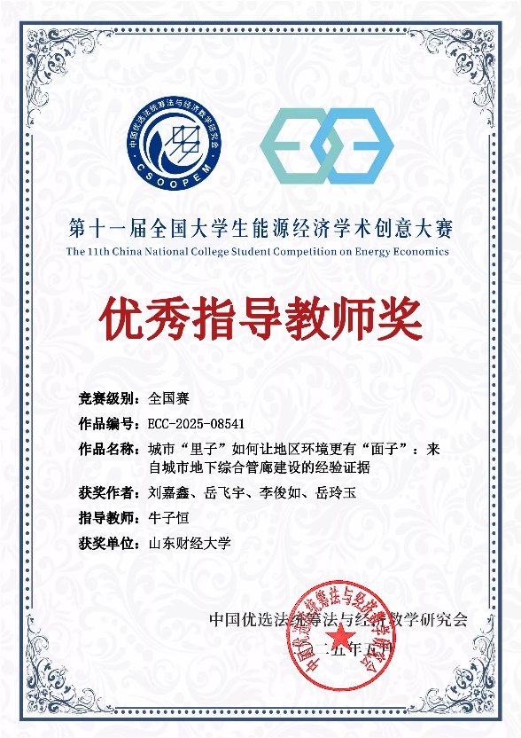 教师牛子恒指导,2023级经济学专业本科生刘嘉鑫作为项目负责人的作品《城市“里子”如何让地区环境更有“面子”:来自城市地下综合管廊建设的经验证据》进入本科组全国总决赛,并获全国一等奖,牛子恒获得优秀指导教师奖,为一帆视频