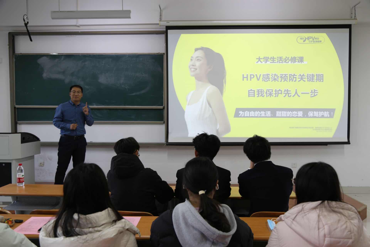 吴文龙分两部分展开讲解。第一部分讲解HPV病毒类型、传播途径及感染危害,重点普及HPV疫苗接种这一核心预防手段,解读不同疫苗适用人群与国家宫颈癌防控政策,破除“无性行为就不会感染”等认知误区,同时介绍相关惠民接种活动,引导学生树立科学防护意识。第二部分围绕艾滋病的定义、传播途径及严重危害展开讲解,强调性传播、血液传播、母婴传播三大传播途径,指出新型毒品对传播的助推作用,普及安全性行为、远离毒品等预防措施,解读检测方法、暴露后预防途径及相关服务平台,引导学生理性防艾。