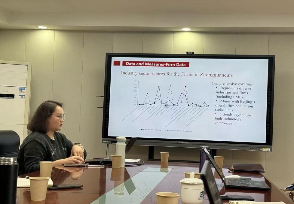 本次报告的主题是“The Variety of Nontradable Consumption Amenities and Local Firm Productivity: Evidence from Restaurants”。郭涛老师基于北京市中关村餐饮业的大众点评数据,深入考察了不可贸易消费便利设施的多样性与企业生产率的影响。文章首先呈现出企业在科技园区边界内的空间分布格局、中关村和北京公司的行业板块份额比较分析等若干特征事实。其次,郭涛老师使用辛普森指数测算了餐厅的多样性。实证结果表明,平均而言,附近餐厅多样性每增加1%,企业全要素生产率就会增加1.5%,且这一影响效应因企业特征而有显著差异。最后,文章的关键机制在于:餐厅多样性有利于吸引人才、提高员工的幸福感、F2F互动带来的知识溢出得到改善和提高创新效率,进而提升企业的生产率。