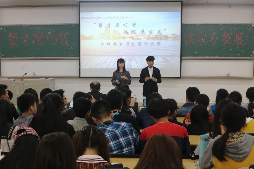 决赛分为PPT汇报展示和回答评委提问两个环节。来自不同学院的参赛者按抽签顺序依次上台演讲。选手们深入家乡所在地进行调研,以家乡发展面临的问题为切入点,利用图表、文字,结合所学经济学知识,就优化家乡经济发展模式,促进家乡经济增长畅所欲言。李振男、徐嘉杞、贾斌小组作品《山东商河张坊乡美丽乡村规划设计书》,从地理环境、交通运输、政府政策等方面介绍张坊乡的农业发展优势,围绕“一村一品、多村一品、富民强乡”的建设目标,提出因地制宜、合理布局,调整农业结构,发展特色农业的规划方案。张悦玥作品《论“油城”的转型规划》,通过展示石油价格走势曲线,剖析石油价格下跌的原因,阐明东营市加快产业结构转型的必要性和紧迫性,并提出开发新能源,发展高新技术产业和第三产业,利用创新驱动发展的新路线,条理清晰、由浅入深、层层递进。姜立阳、黄璐小组作品《菏泽左营乡扶贫政策落实规划设计方案》,指出政府扶贫的关键是“扶真贫、真扶贫、摸好群众情况”,严格扶贫资金管理,切实发挥扶贫资金的作用,利用大棚瓜菜特色产业托起“致富梦”。同时,左营乡要加大宣传力度,打造品牌产业、品牌乡村。赵盈华作品《山东章丘旭升村美丽乡村规划设计书》着眼三农问题,着力于形成以城带乡,以农带高的特色产业链,从工农商三方面提出对策,以缩小城乡差距,扩大高素质人群规模。言辞深刻,一针见血。评委提问环节,选手们成竹在胸、情绪饱满,姿态自信从容,表述流利自然,思路缜密清晰,精彩的演讲引来场下观众的热烈掌声。最终,一帆视频