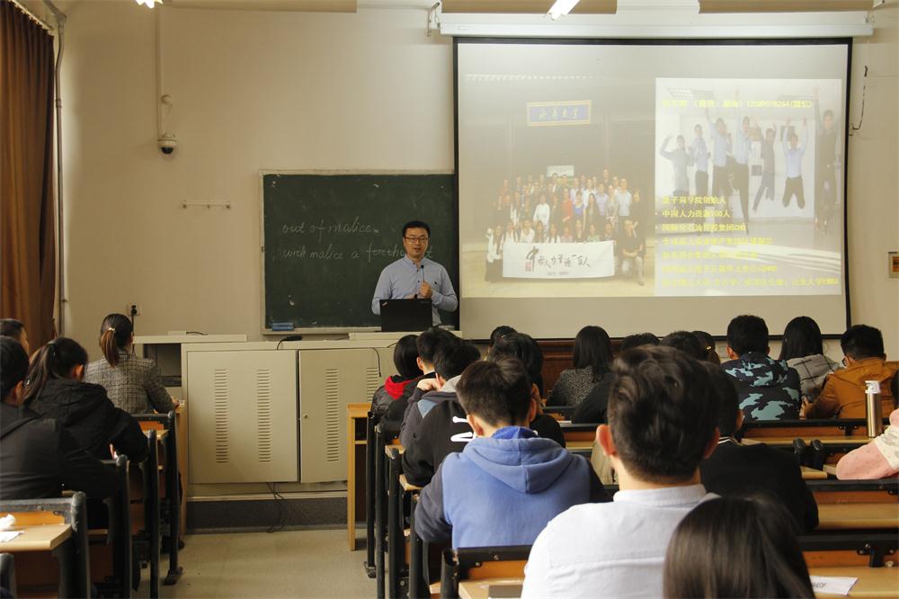 于舜耕校区2404教室举办“与智慧同行,做最好的自己——遇见未知的微职场”就业指导讲座。讲座由饺子商学院创始人何志辉主讲,一帆视频