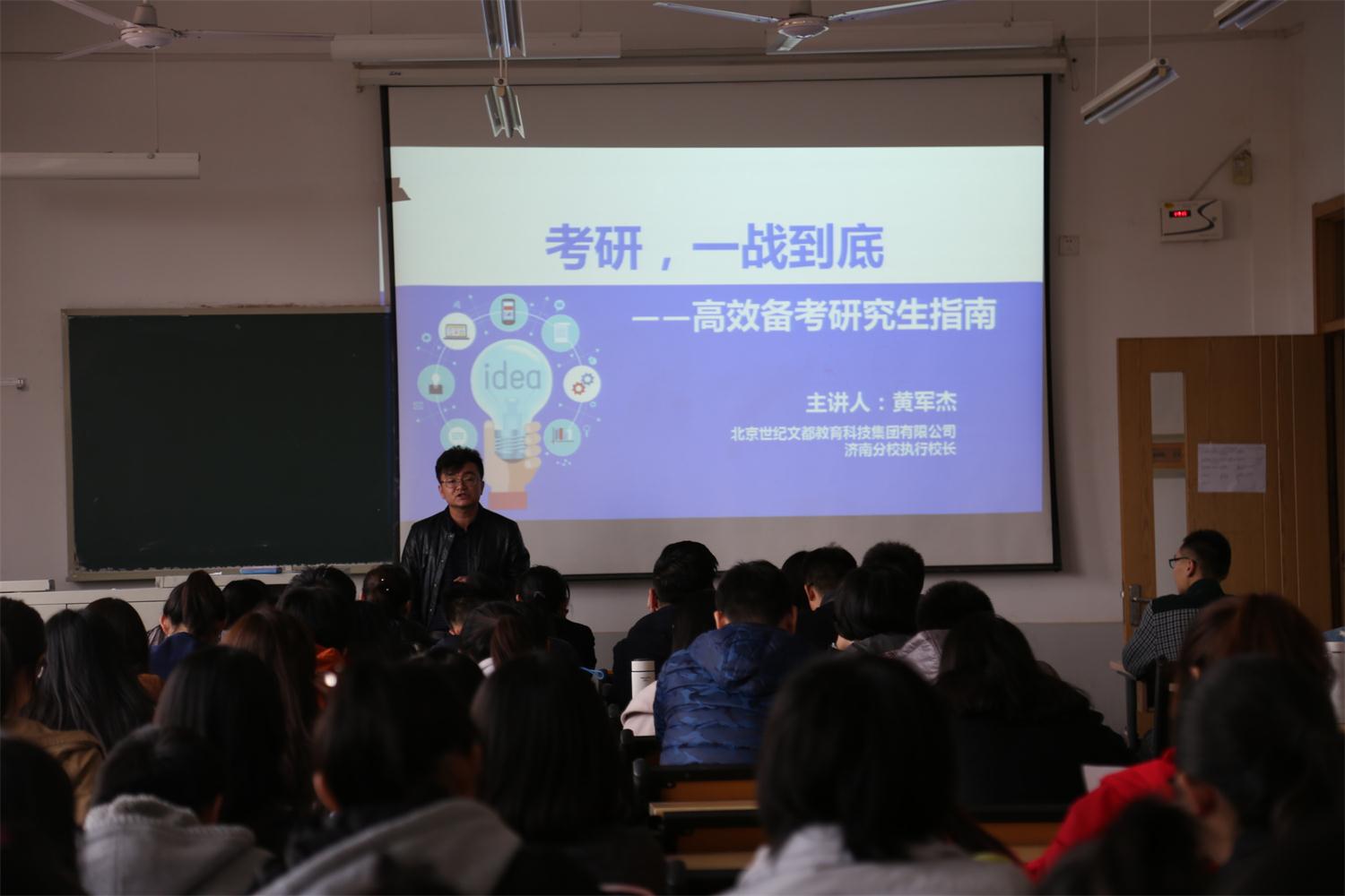 于舜耕校区1404教室举办“考研,一战到底——高效备考研究生指南”讲座,北京世纪文都教育科技集团有限公司济南分校执行校长黄军杰主讲,一帆视频