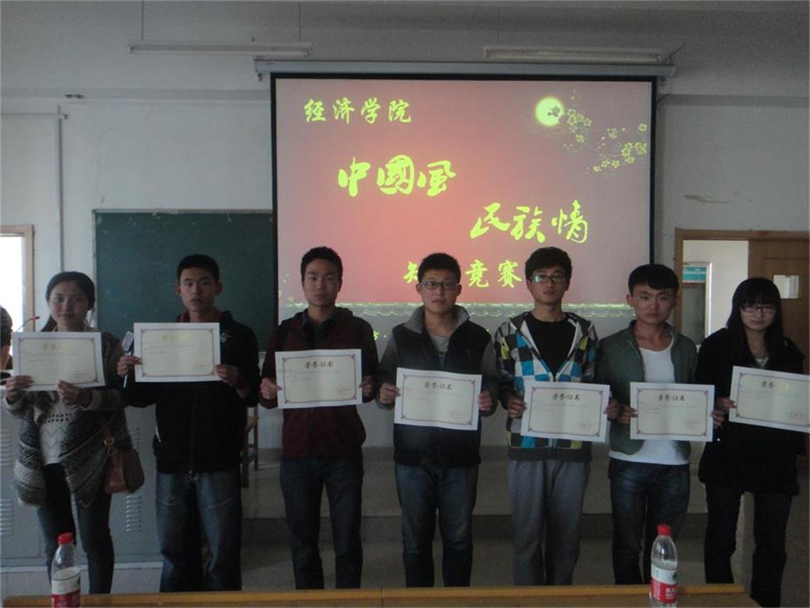 竞赛以班级为单位分成8个代表队,每队8人,其中参赛选手3人,亲友团5人。“限时问答”环节中,参赛选手认真审题,迅速组织答案,争分夺秒答题;“听词猜谜”、“看图识民族”环节中,选手根据关键词和大屏幕插图抢答竞猜,沉着冷静,思维缜密,从容应答;在才艺展示环节,各队亲友团为大家带来精彩纷呈的表演,洋溢着浓郁的民族风情,少数民族语言诗歌朗诵铿锵有力、掷地有声,歌曲演唱婉转悠扬、感情充沛,赢得在场同学们的热烈掌声。经过紧张激烈的角逐,13级农村区域与发展班获得一等奖,经济学一班、四班获得二等奖,资源与环境经济学班、经济学三班和二班代表队获得三等奖,经管一、二班代表队获得优秀奖。