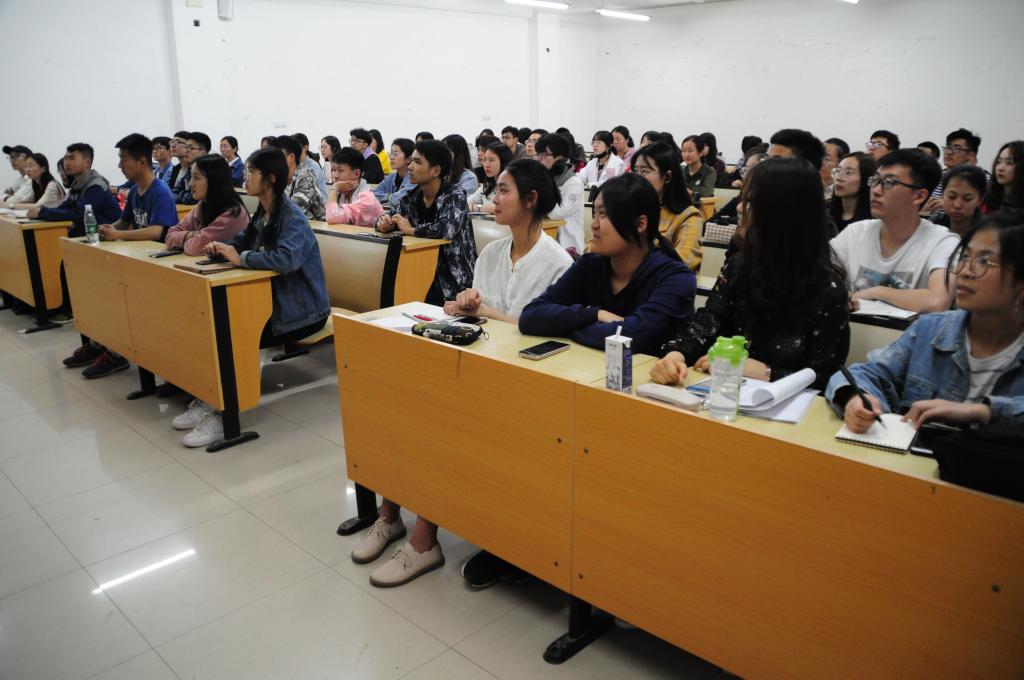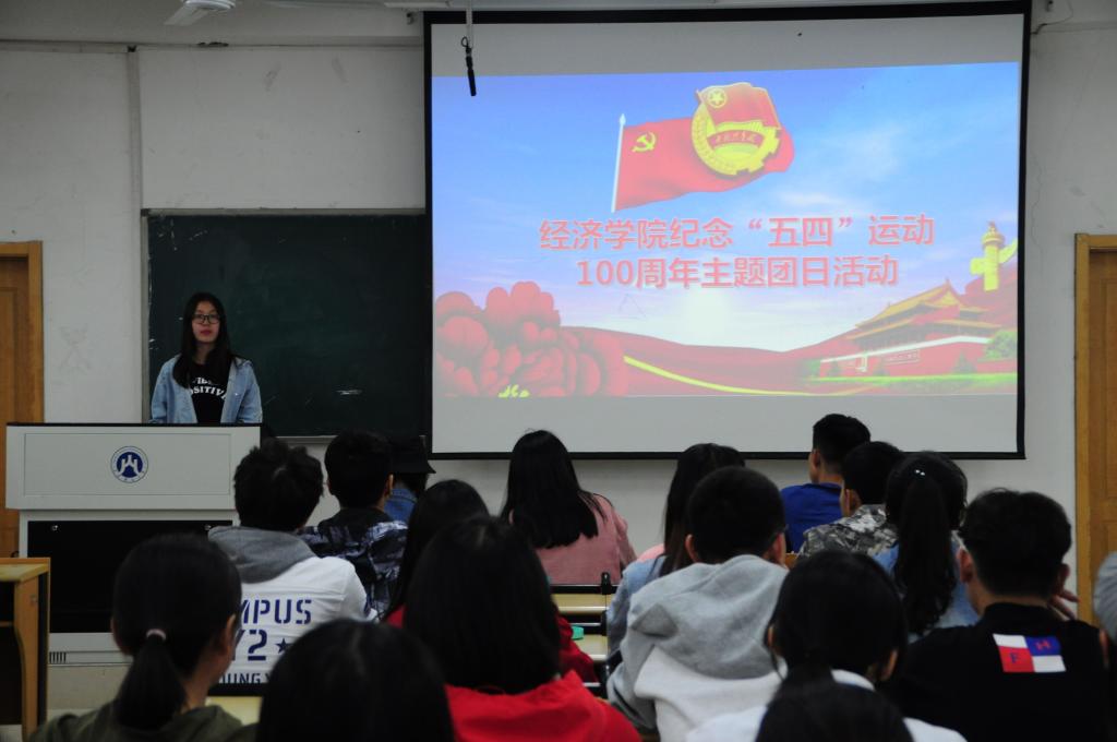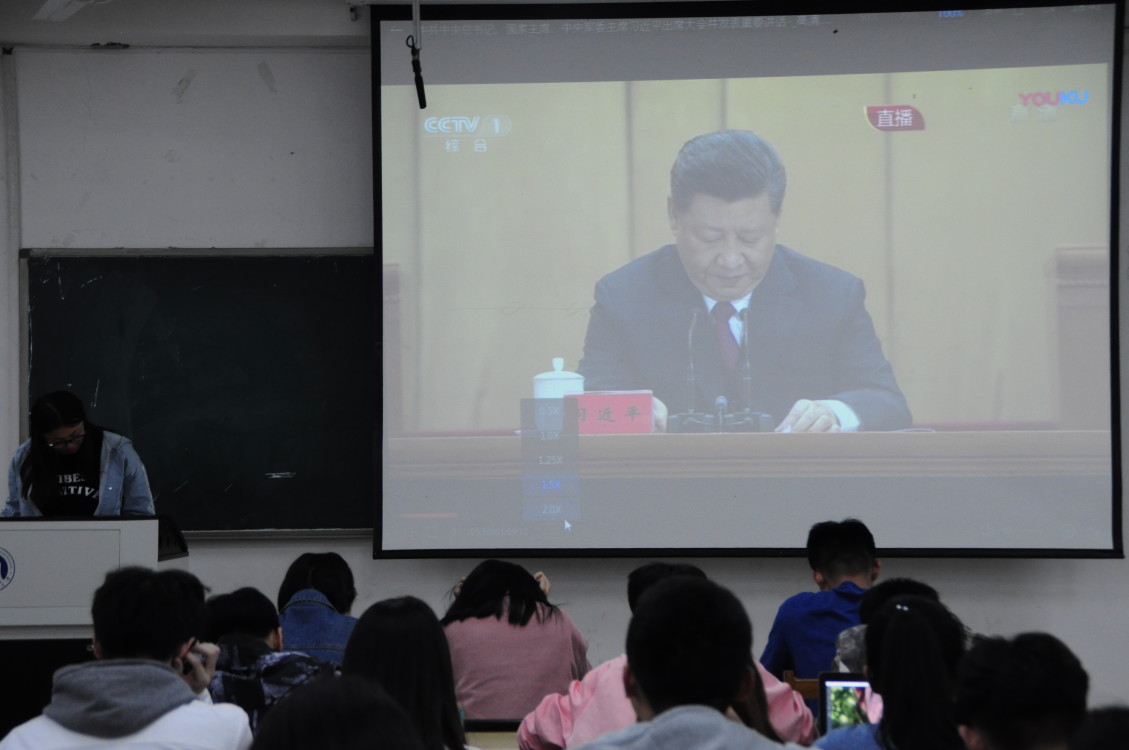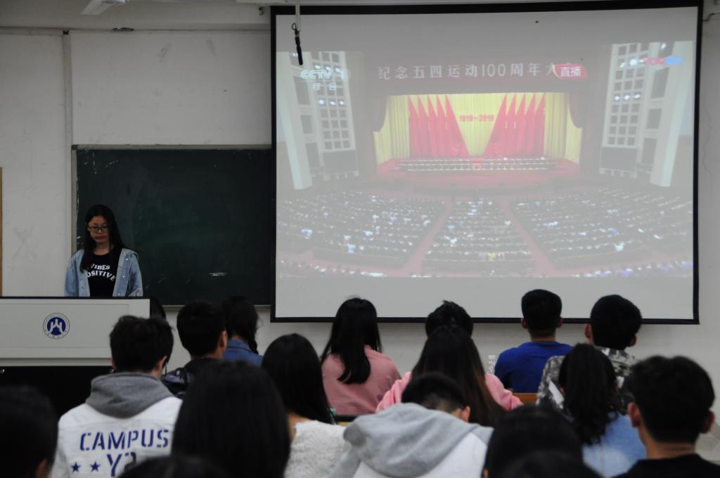 于圣井校区敏行楼组织团员青年观看纪念五四运动100周年大会实况。