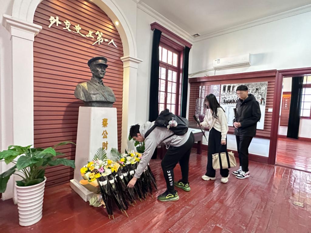 全体师生手持白色菊花,面向革命烈士蔡公时纪念铜像行鞠躬礼并默哀,沉痛悼念民国第一位抗日烈士蔡公时,表达对革命先辈的崇高敬仰和缅怀之情。
