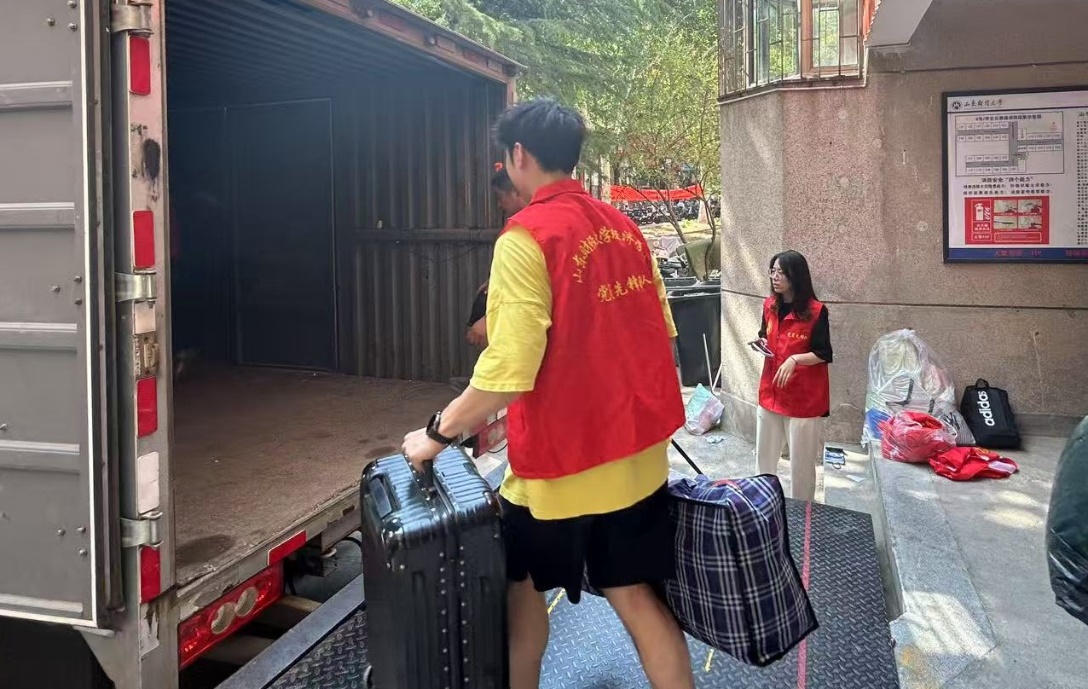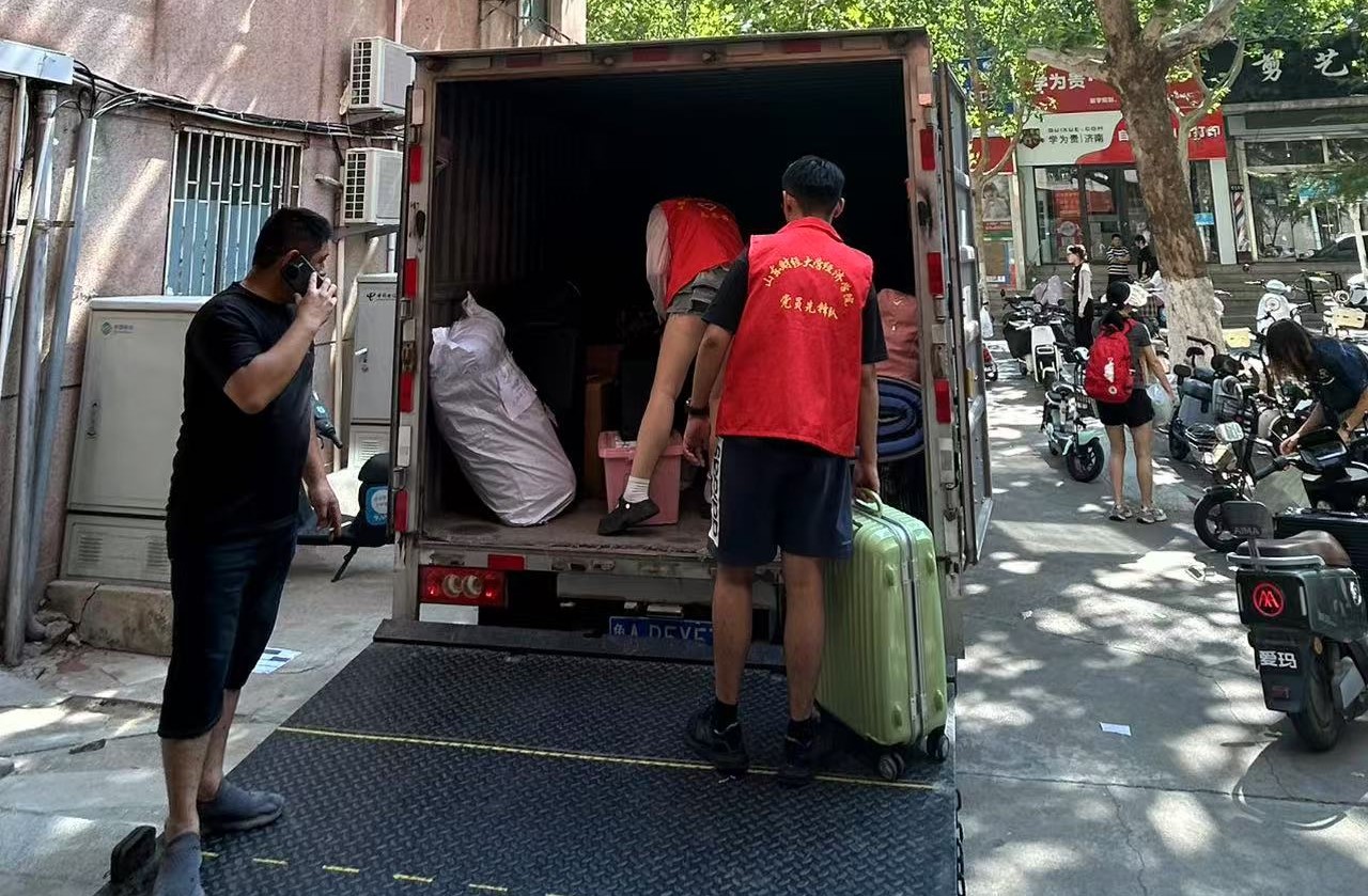 为确保搬迁工作平稳、有序、高效进行,学院提前制定了详细搬迁方案,成立专项工作组,明确职责分工,将责任细化到岗、任务落实到人。学院统筹协调车辆,为搬迁学生统一配备行李袋,辅导员和志愿者悉数到场,分赴各宿舍楼层节点坐镇指挥,实时协调解决突发状况,确保整个搬迁过程“零差错、零延误”,将“安全第一、服务优先”的要求落到实处。党员先锋队和志愿者身着醒目的红马甲,提前抵达搬迁现场,迅速分组、明确分工,规划搬运路线和货车调度,协助同学归纳打包、封箱并用标签清晰标识。他们积极响应,多岗位协同作战,从宿舍内接力传递行李,构筑高效搬运通道,到装车点严谨核对行李信息;从留守原宿舍楼逐间清点物品,提醒办理退宿,到引导货车装载运送路线;从协助装卸车搬运行李,安置看管零散物品,到各楼道口耐心维护秩序……志愿者们分工协作,配合默契,忙碌的身影遍布各个环节,用实际行动诠释着青春担当与无私奉献的志愿服务精神。