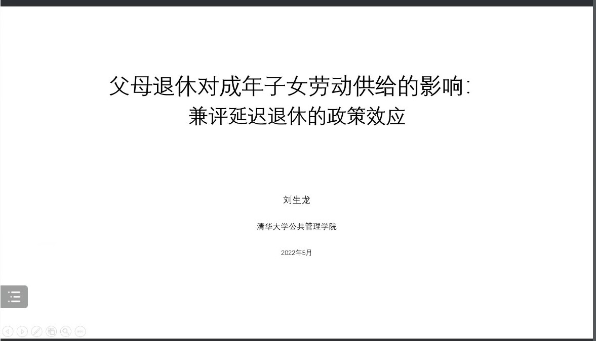本次报告的主题是“父母退休对成年子女劳动供给的影�:兼评延迟退休的政策效应”。围绕这一研究主题,刘生龙研究员分别从制度背景、实证分析、延迟退休的政策模拟和结论及政策启示等方面进行阐述�