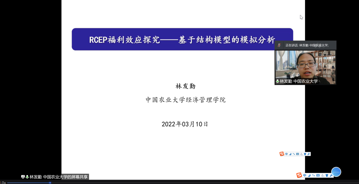 本次报告主题是“RCEP的福利效�-基于结构模型的测算”。围绕这一主题,林发勤教授从引言、理论模型、数据和模拟策略及估计结果四个方面由浅入深的阐述了RCEP引致的关税削减代表的贸易成本与福利之间的相关关系�