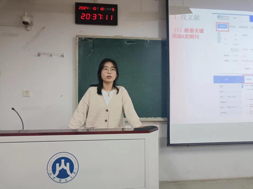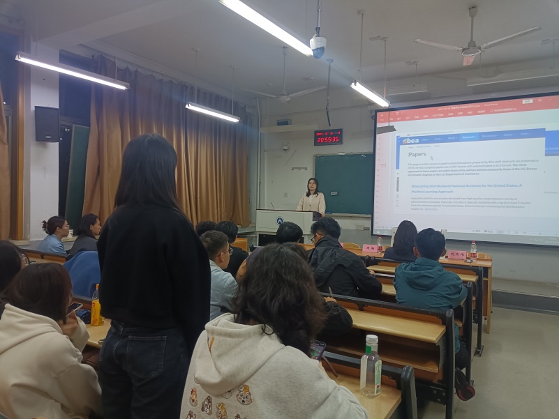 刘燕伟根据自己的科研经验,向同学们讲解了通过各种资源库与软件工具查找文献、阅读文献、整理文献等科研方法。她推荐了多种英文文献检索网站,如Web of Science、谷歌学术等;还介绍了多种常用的文献管理工具,如Zotero、Endnote等。她指出,在论文的选题与写作时要合理使用计量模型,可以通过国家数据网站、中国统计年鉴等途径搜集模型建立所需要的数据。