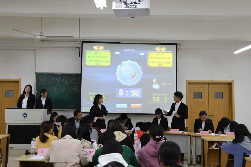 2019级8个班级参赛。经过几轮激烈角逐,2019级经济学三班、经济学四班展开最后比拼。双方围绕辩题“人生道路上要乘胜追击还是见好就收”展开论辩。正方一辩开门见山、自信大方,围绕“乘胜追击更有利于实现个人价值以及个人对社会产生更大的贡献”的观点,分别从乘胜追击有利于抓住转瞬即逝的机会、有利于形成积极进取的人生价值观以及可以更好适应社会的需要三个方面进行论证,层次分明,逻辑严谨。反方不甘示弱,思维缜密,紧扣“人生道路上要见好就收”的论题,提出“见好就收能够最大程度降低做出错误决策的风险,保证既得利益,选择更加有把握的道路”的观点,在此前提下层层剖析,见解深刻。盘问质询与对辩环节中,两支队伍唇枪舌战,旁征博引,针锋相对,赛场气氛紧张激烈,双方辩论队为观众呈现了一场思辩盛宴。