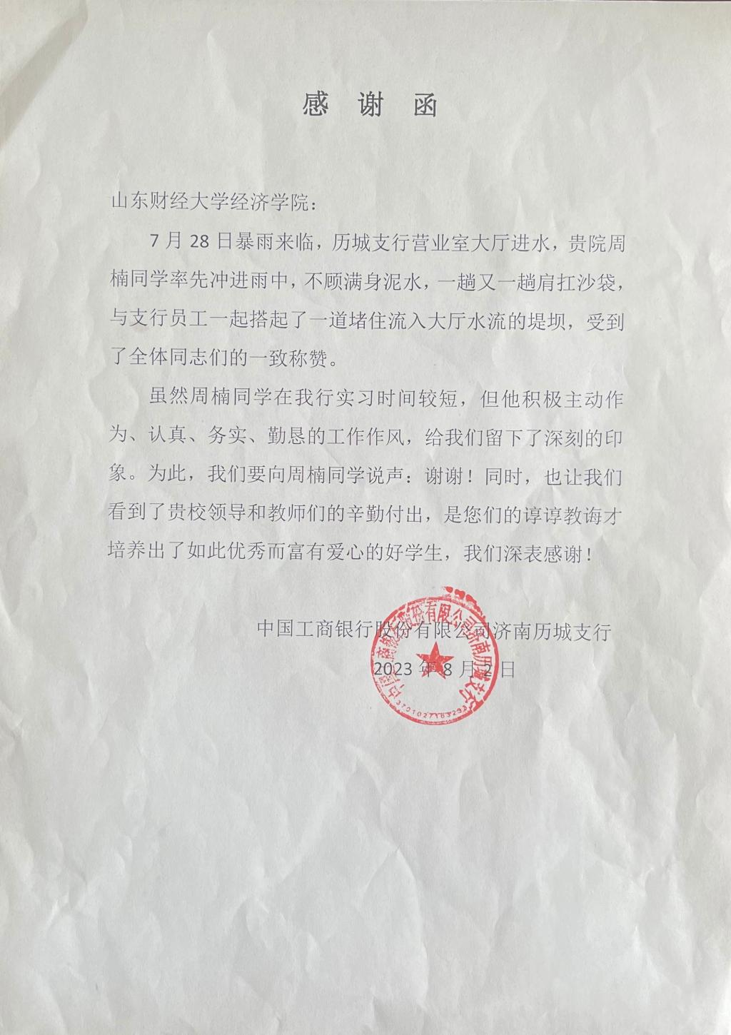 2023级研究生新生周楠二话不说,和同事一起拿起拖把往外推水。由于雨势太大,推水的效果并不是很好,周楠又率先冲进雨中,不顾满身泥水,一趟又一趟肩扛沙袋,与支行员工一起搭起了一道堵住流入大厅水流的堤坝。本以为是件再平常不过的小事儿,中国工商银行济南历城支行特意发来感谢信。信中说到:“虽然周楠同学在我行实习时间较短,但他积极主动作为、认真、务实、勤恳的工作作风,给我们留下了深刻的印象。为此,我们要向周楠同学说声:谢谢!同时,也让我们看到了贵校领导和教师们的辛勤付出,是您们的谆谆教诲才培养出了如此优秀而富有爱心的好学生,我们深表感谢!”