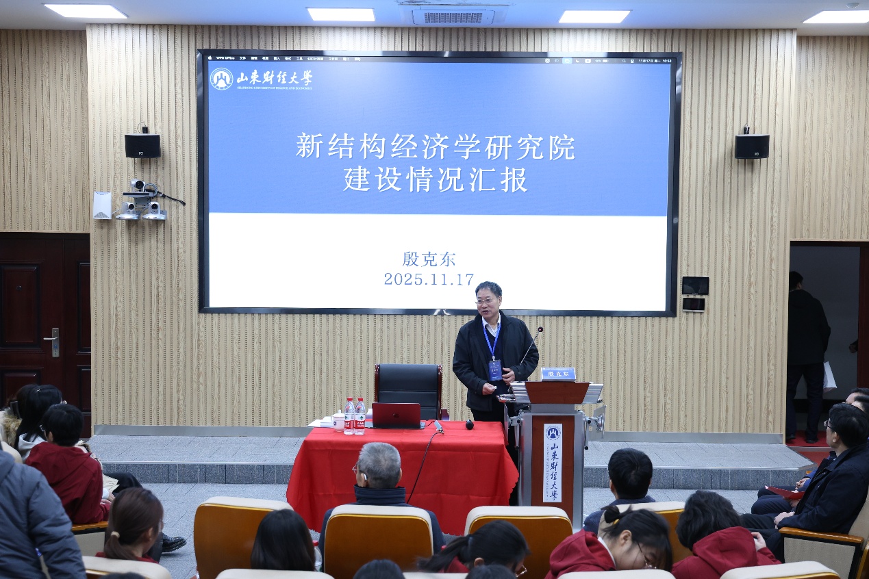 院长殷克东对新结构经济学研究院的建设情况进行了汇报,他从组织结构、办公场所、硬件设备、师资力量、课程体系、教研成果、学生活动以及与北京大学新结构经济学研究院的互动交流情况等多个方面向林毅夫教授进行了详细介绍,并表示将进一步支持新结构经济学研究院发展,强化新结构经济学卓越人才实验班的人才培养体系。