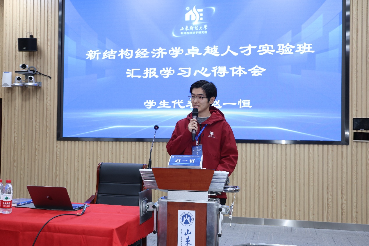 随后,2024级新结构经济学卓越人才实验班的赵一恒同学作为学生代表发言。赵一恒同学在汇报中回忆了自己与新结构经济学的不解之缘,分享了自己收到林毅夫教授回信时的激动和喜悦之情,并代表全班同学向林毅夫教授及各位领导老师做出承诺。他表示,作为新一代新结构经济学人,他们有勇气,也有信心,能够接过发展新结构经济学的接力棒,继续谱写这门学科的崭新篇章,为实现中华民族伟大复兴,构建人类命运共同体,贡献属于新结构经济学人的青春力量。
